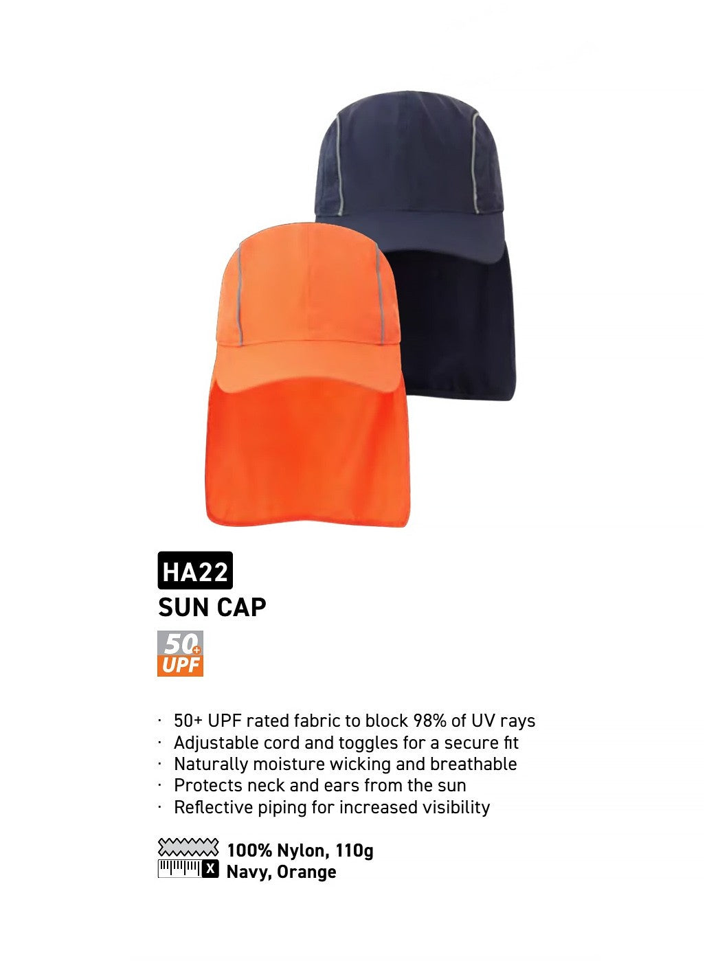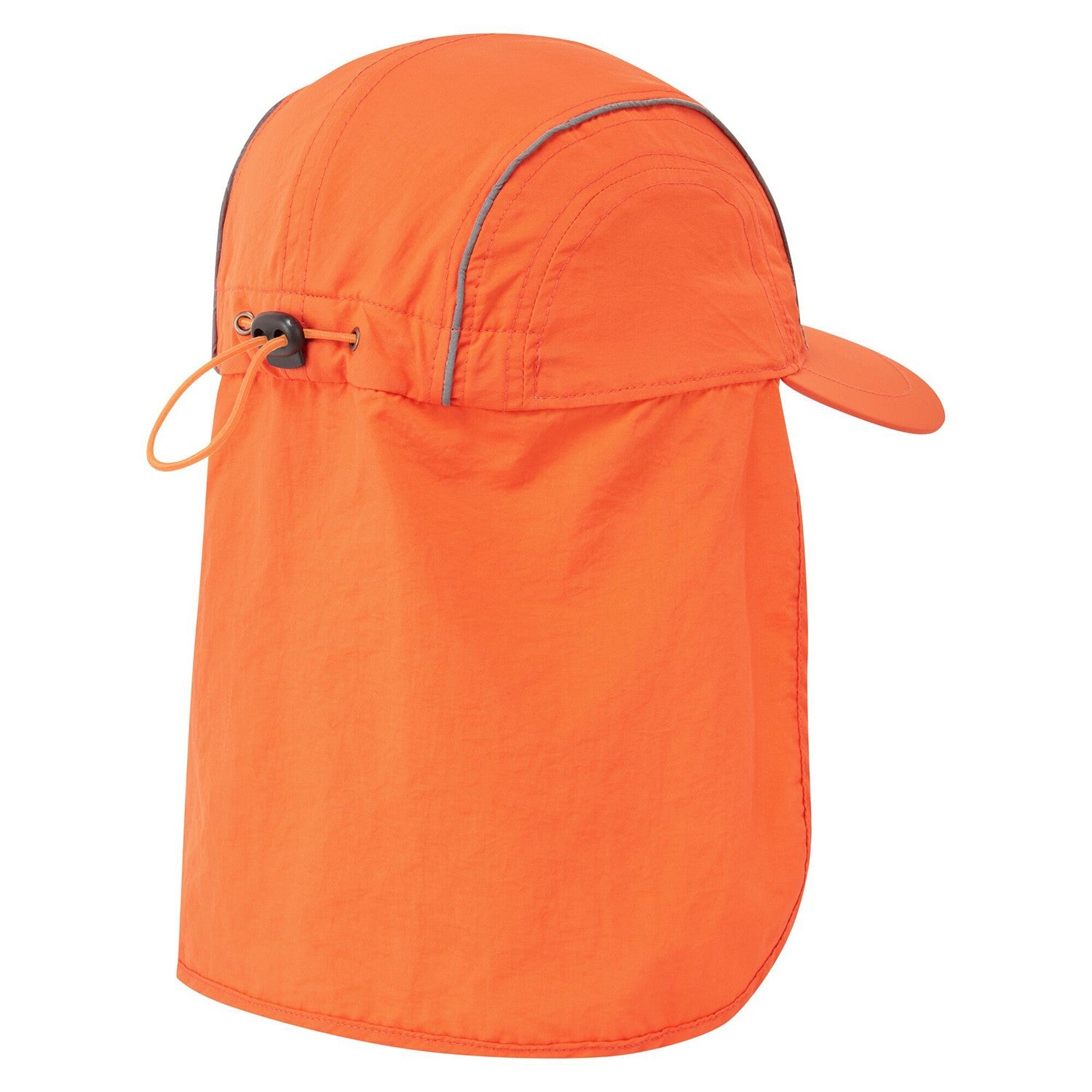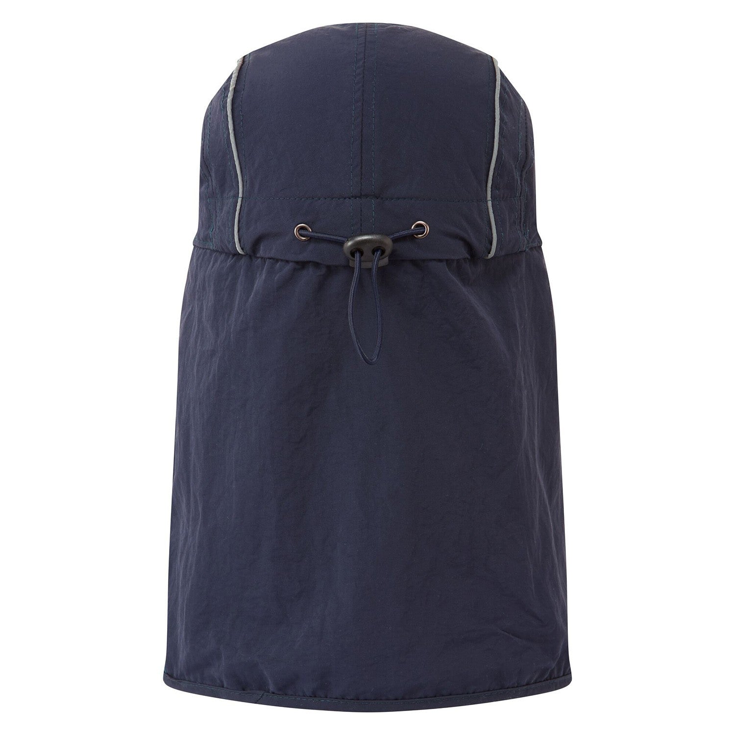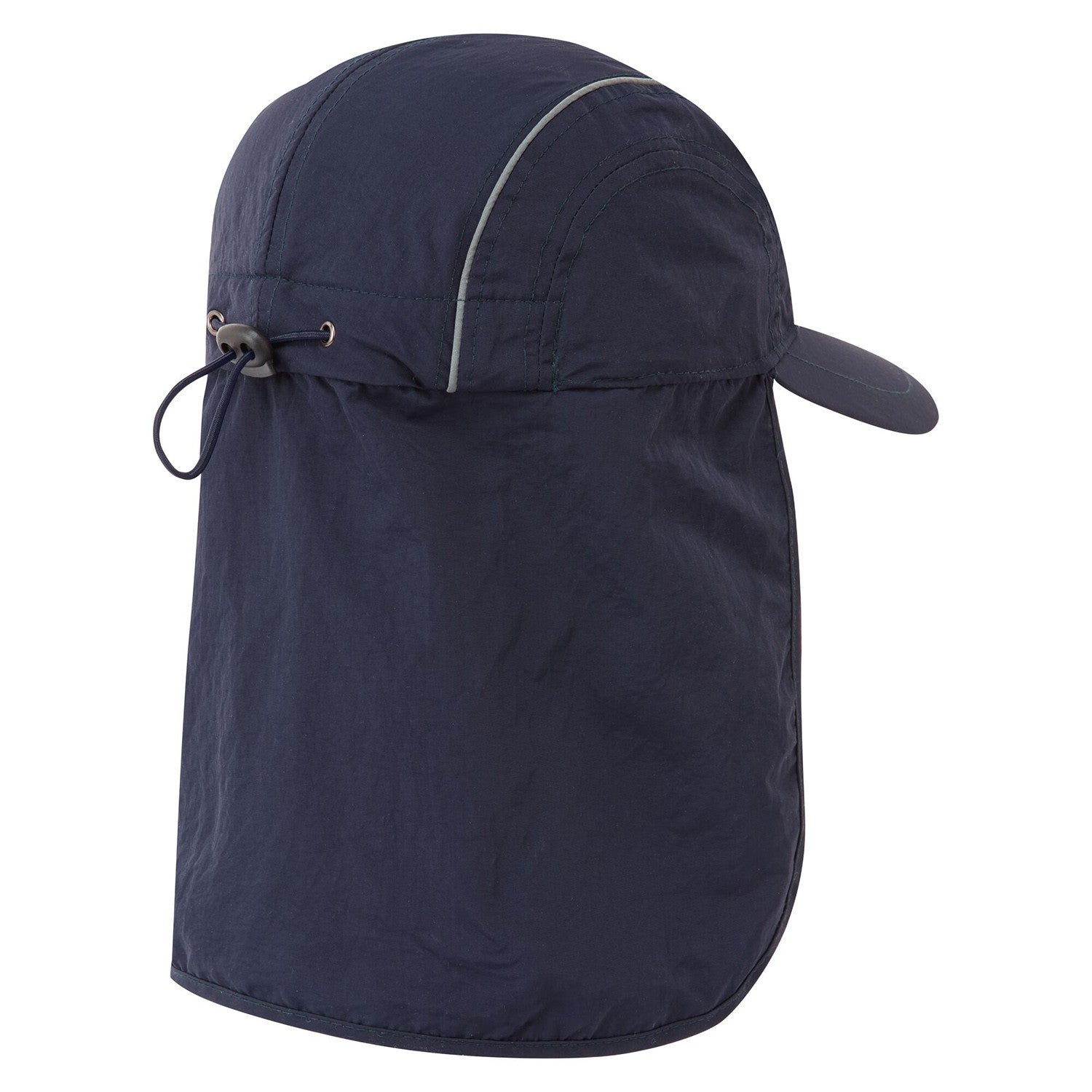 Lightweight panelled cap with reflective piping and sun shade for neck protection. Adjustable plastic toggle and bungee cord at the back of the cap. Available in two colours, ideal for work outside.