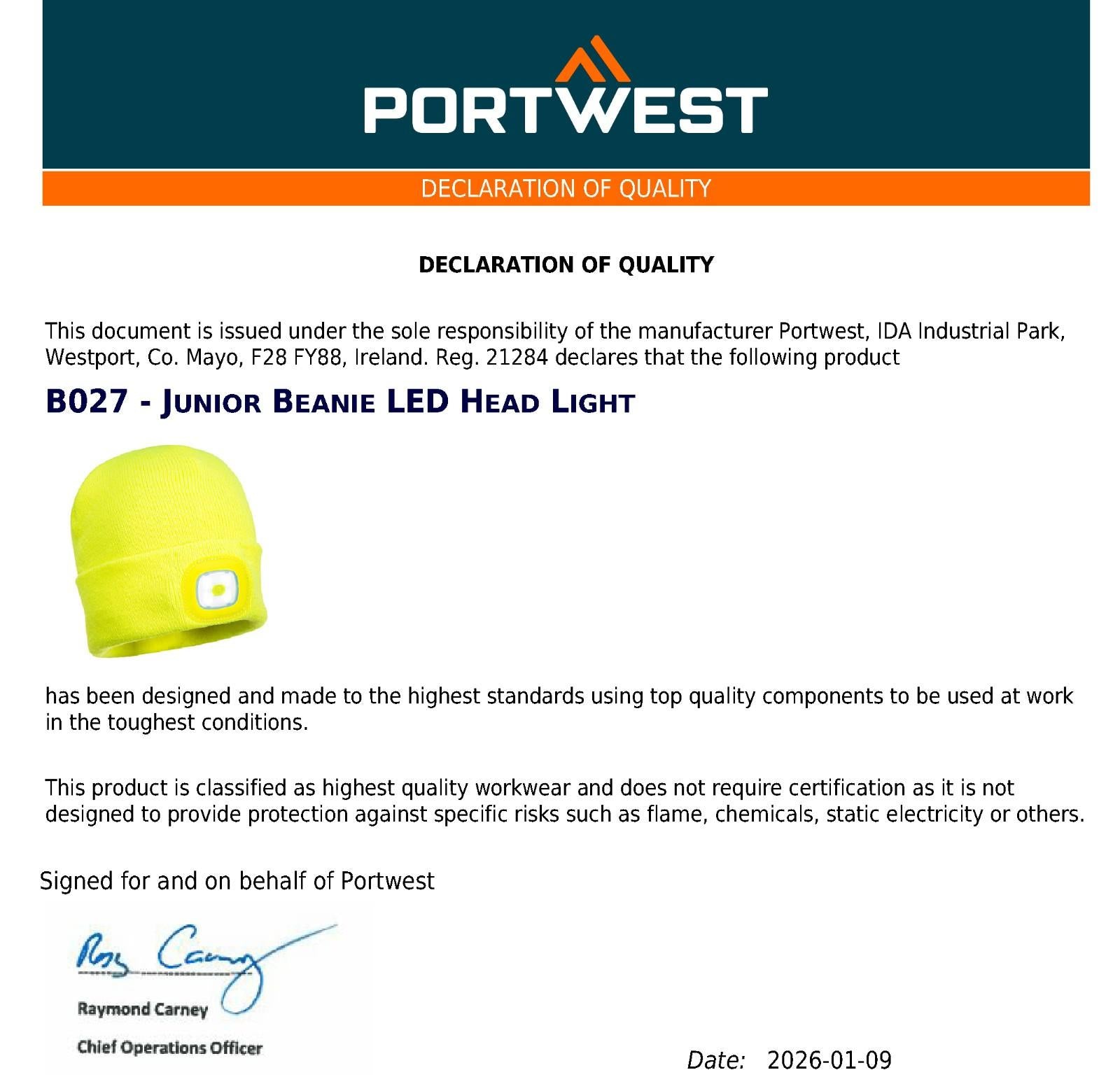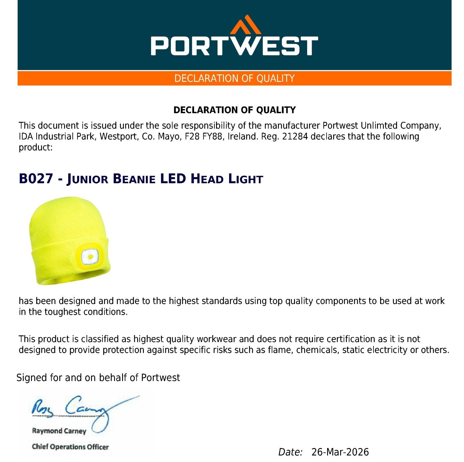 Portwest USB Rechargeable LED Head Light Knitted Beanie for Kids Junior Boys Girls B027