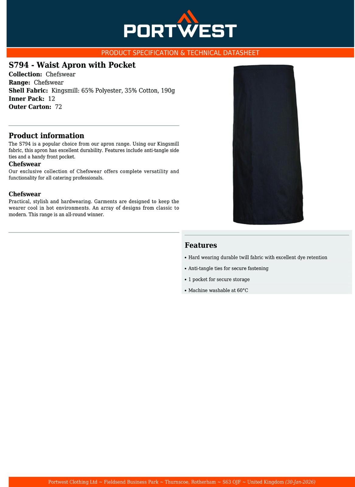 The S794 is a popular choice from our apron range. Using our Kingsmill fabric, this apron has excellent durability. Features include anti-tangle side ties and a handy front pocket.