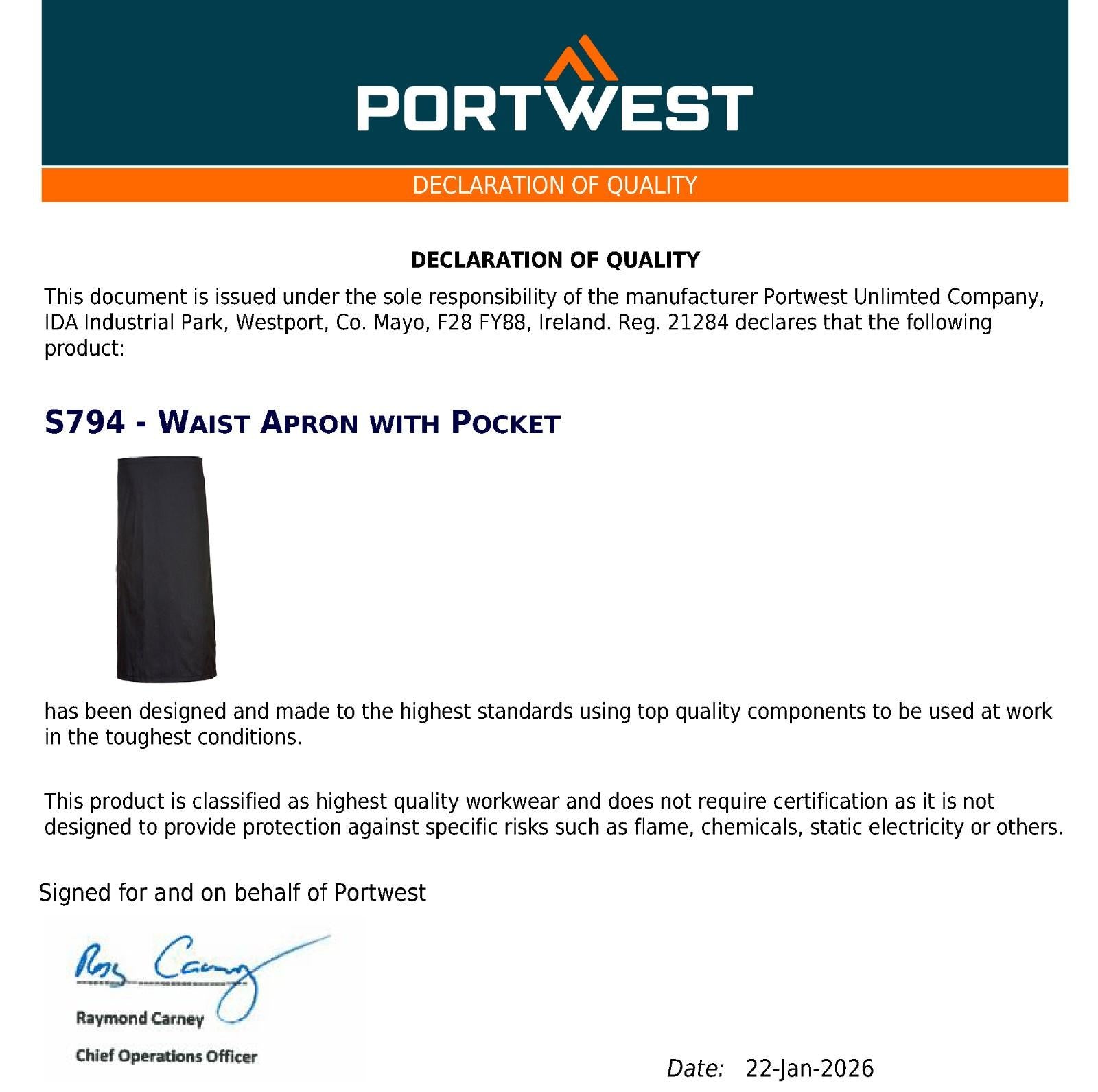 3pcs Portwest S794 3/4 Long Half Waist Apron with Pocket Kitchen Cafe Chef Bulk