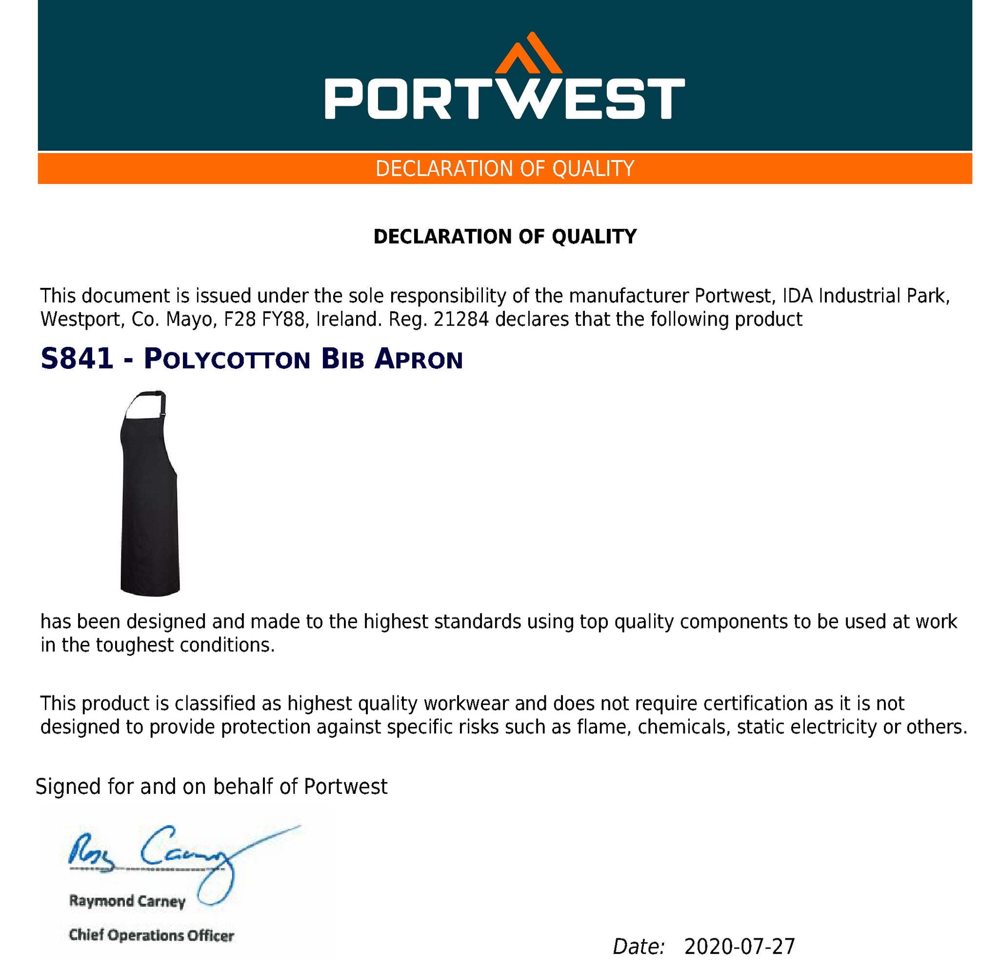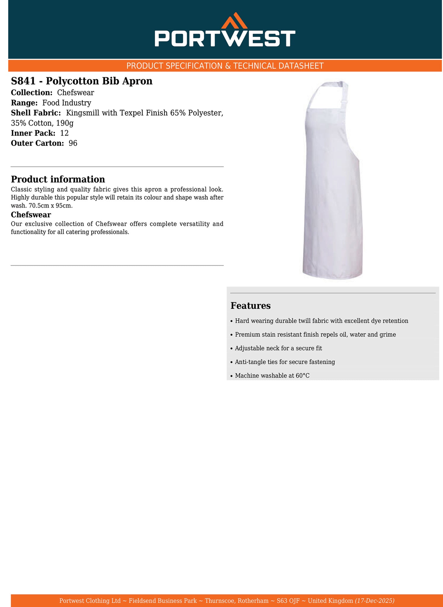 Portwest S841 Bib Apron Adjustable Polycotton Mens Womens kitchen Cooking Chef Uniform