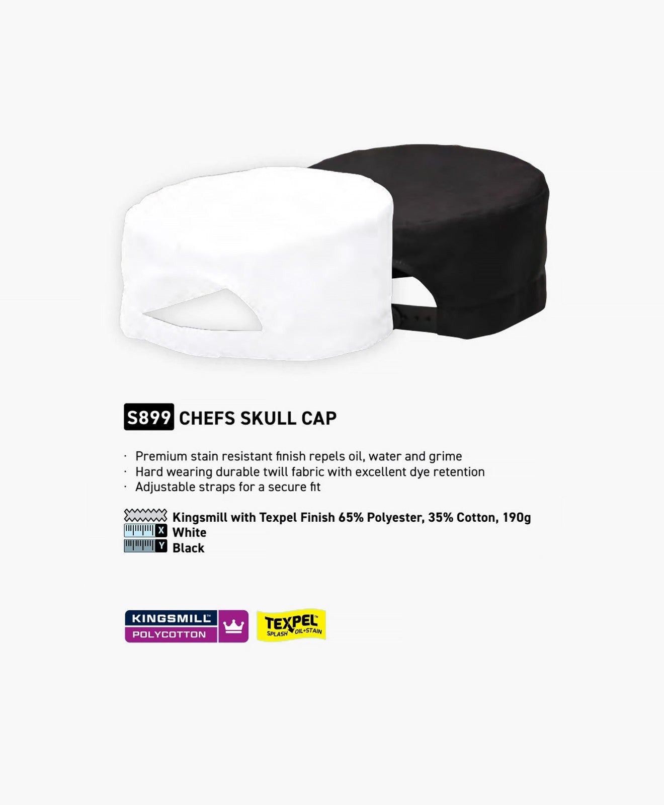 The S899 Skull Cap gives a stylish addition to the Chefswear range. Hook and loop adjustment gives a comfortable fit and the Kingsmill fabric guarantees maximum performance.