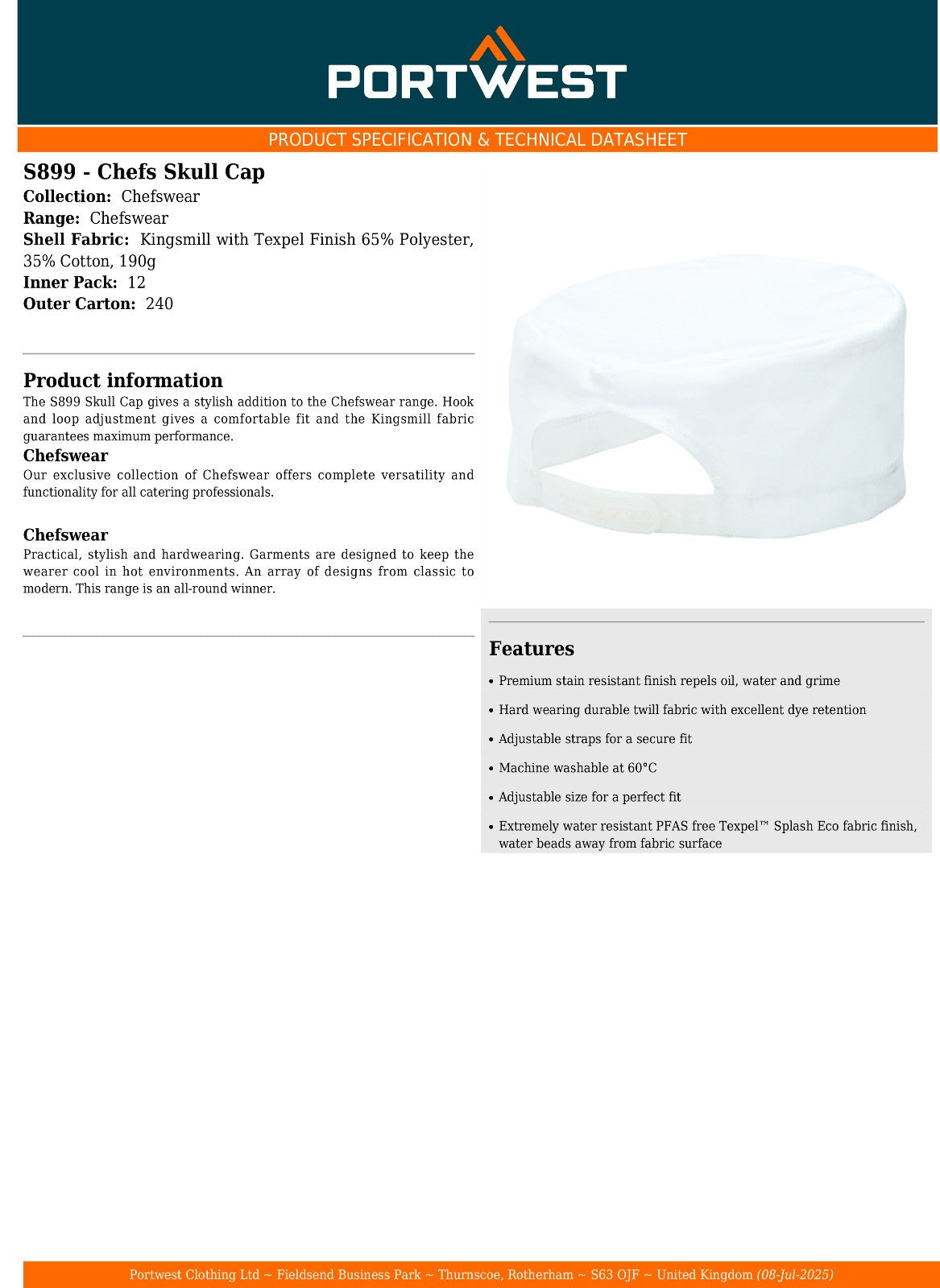 The S899 Skull Cap gives a stylish addition to the Chefswear range. Hook and loop adjustment gives a comfortable fit and the Kingsmill fabric guarantees maximum performance.