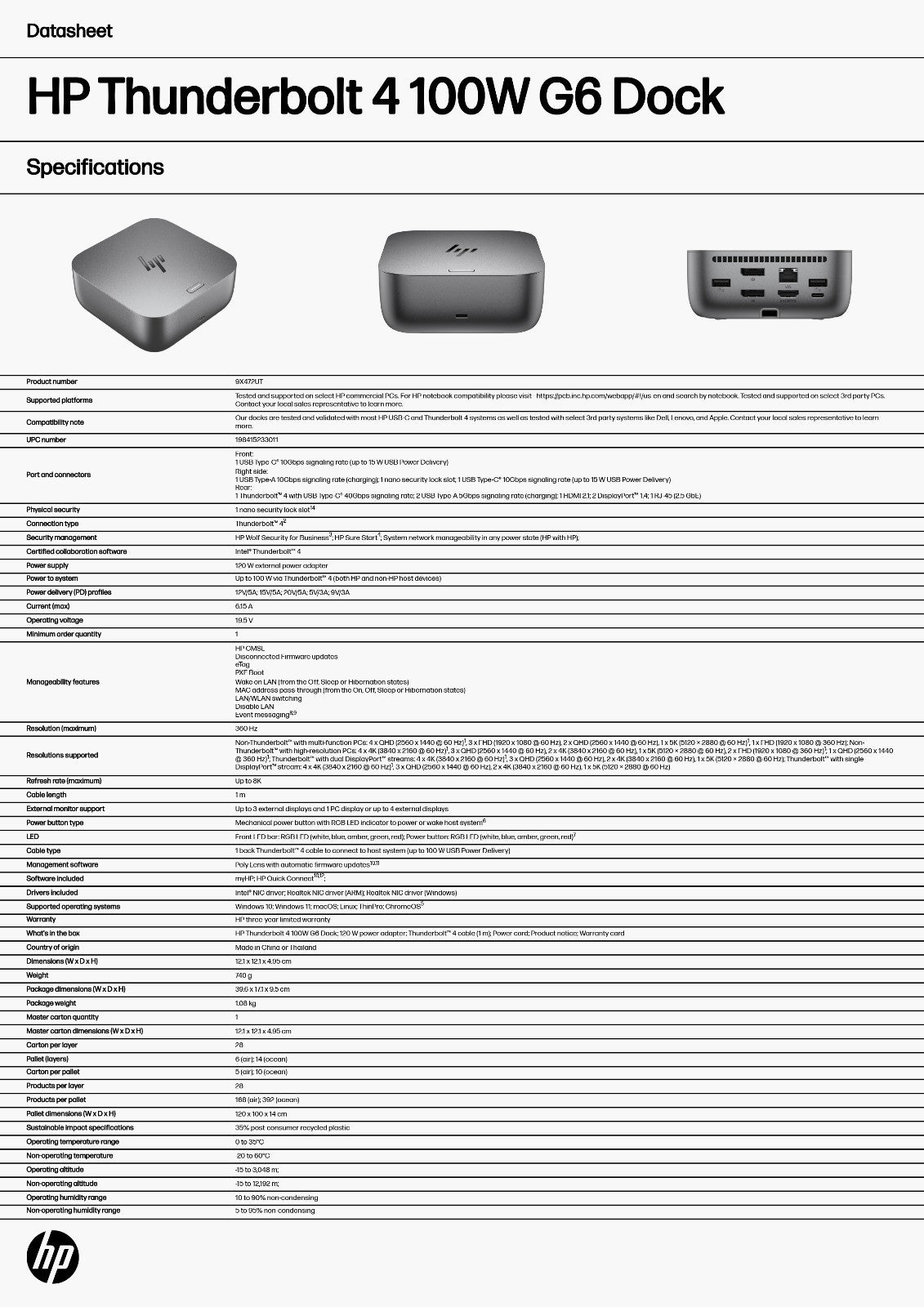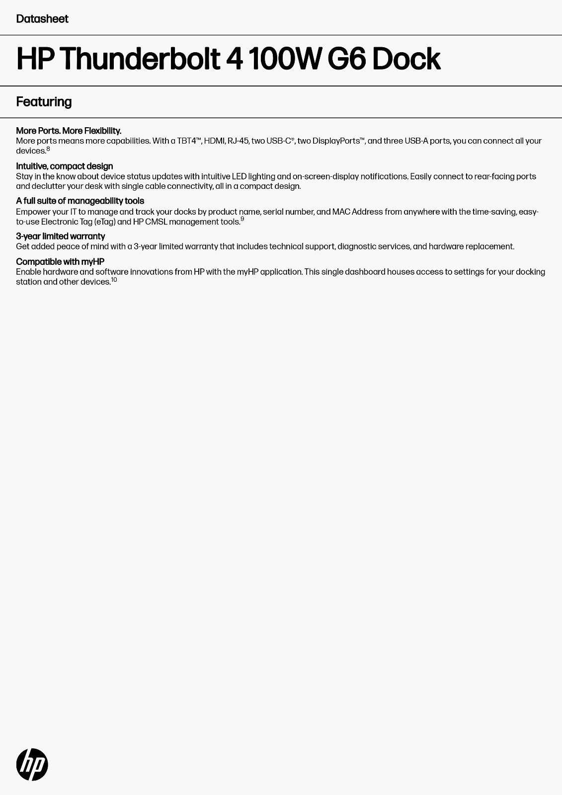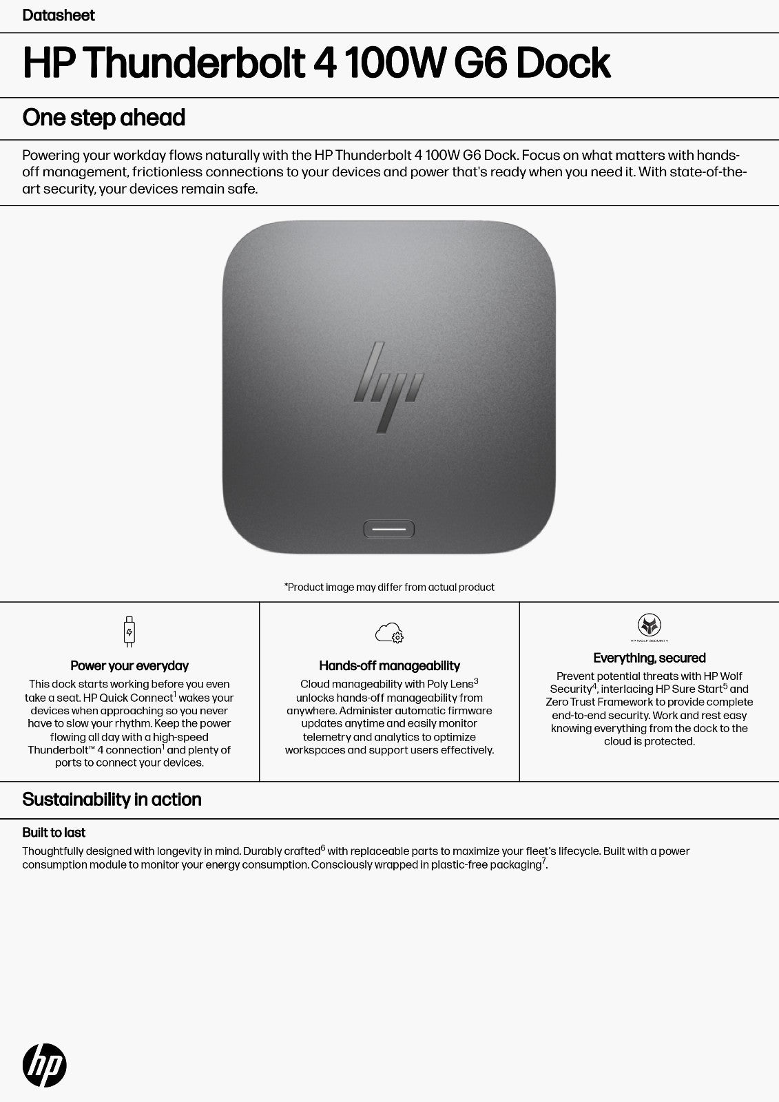 Powering your workday flows naturally with the HP Thunderbolt 4 100W G6 Dock. Focus on what matters with hands-off management, frictionless connections to your devices and power that's ready when you need it. With state-of-the-art security, your devices remain safe.