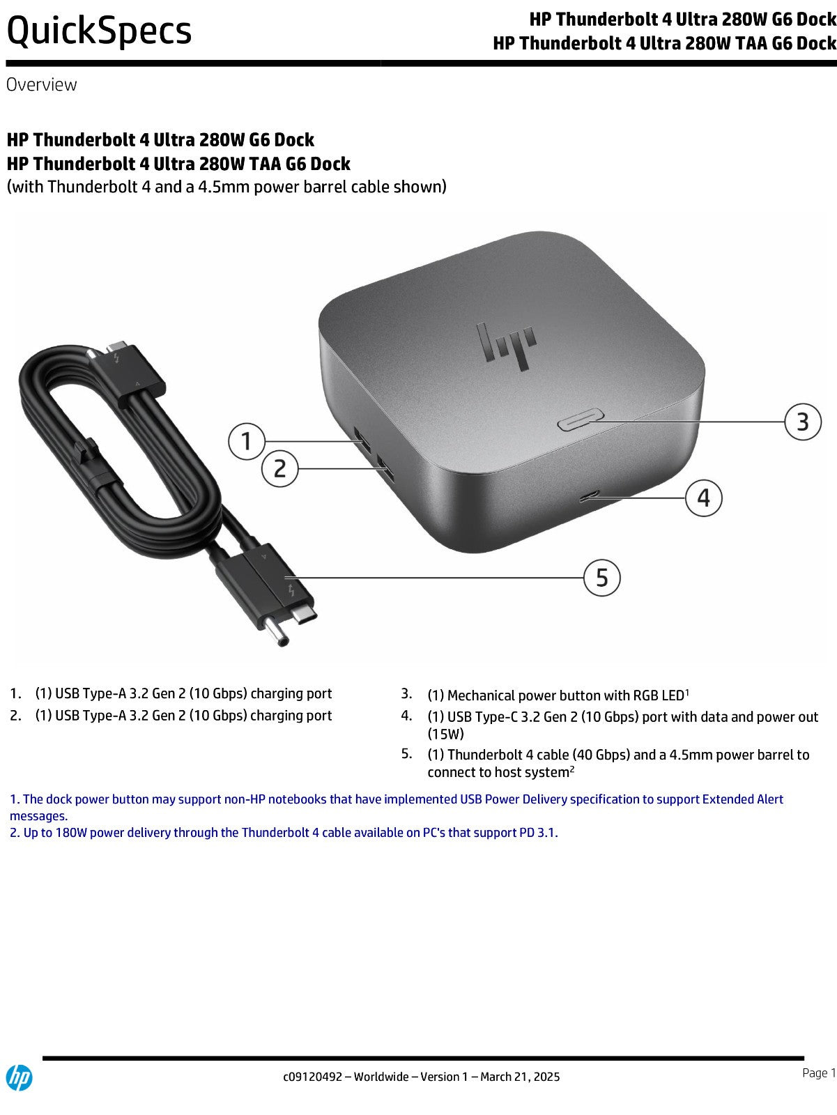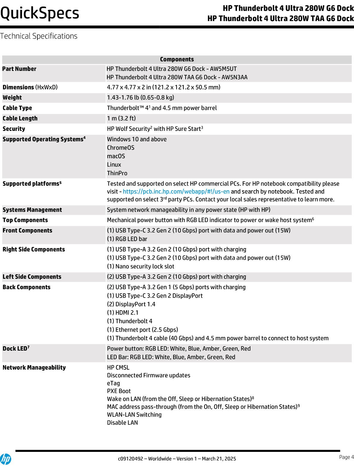 * Based on HP’s internal analysis of docking stations that are Thunderbolt™ 4, have auto validating & self healing firmware, Meet NIST 800-173 requirements, the ability to disable the RJ-45 and a BIOS MAPT authorized list. HP Sure Start on HP Thunderbolt G6 dock supports firmware integrity verification and recovery during dock start-up and disconnect. It does not include real-time and runtime protections or Microsoft SCCM integration typically found on HP Sure Start in HP notebooks.