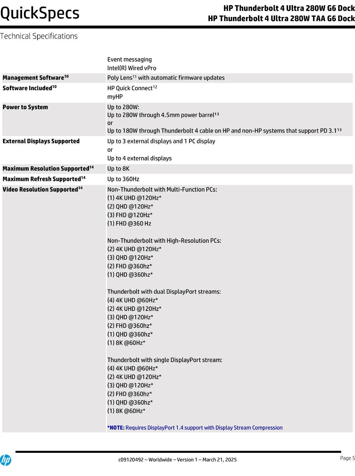 * For full data and video capability, the PC must support either: DisplayPort™ alt mode, Thunderbolt™ 3 alt mode, or USB4 through its USB-C® port. Charging and port replication are supported on notebooks that have implemented the USB-C® Power Delivery specifications. HP Quick Connect, Wake-on LAN from warm and cold dock, Wake-on LAN from S4/S5, and MAC Address Pass-Through, S0, S3, S4, S5 when connecting an on or off notebook to the dock features only function on HP or HP supported notebooks. HP does not provide ethernet and audio drivers on Mac PCs. Power button to turn off or to wake the system depends on implementation of the related and optional Power Delivery specification.