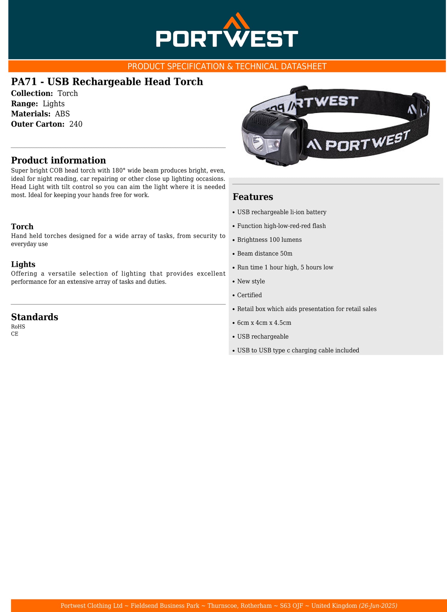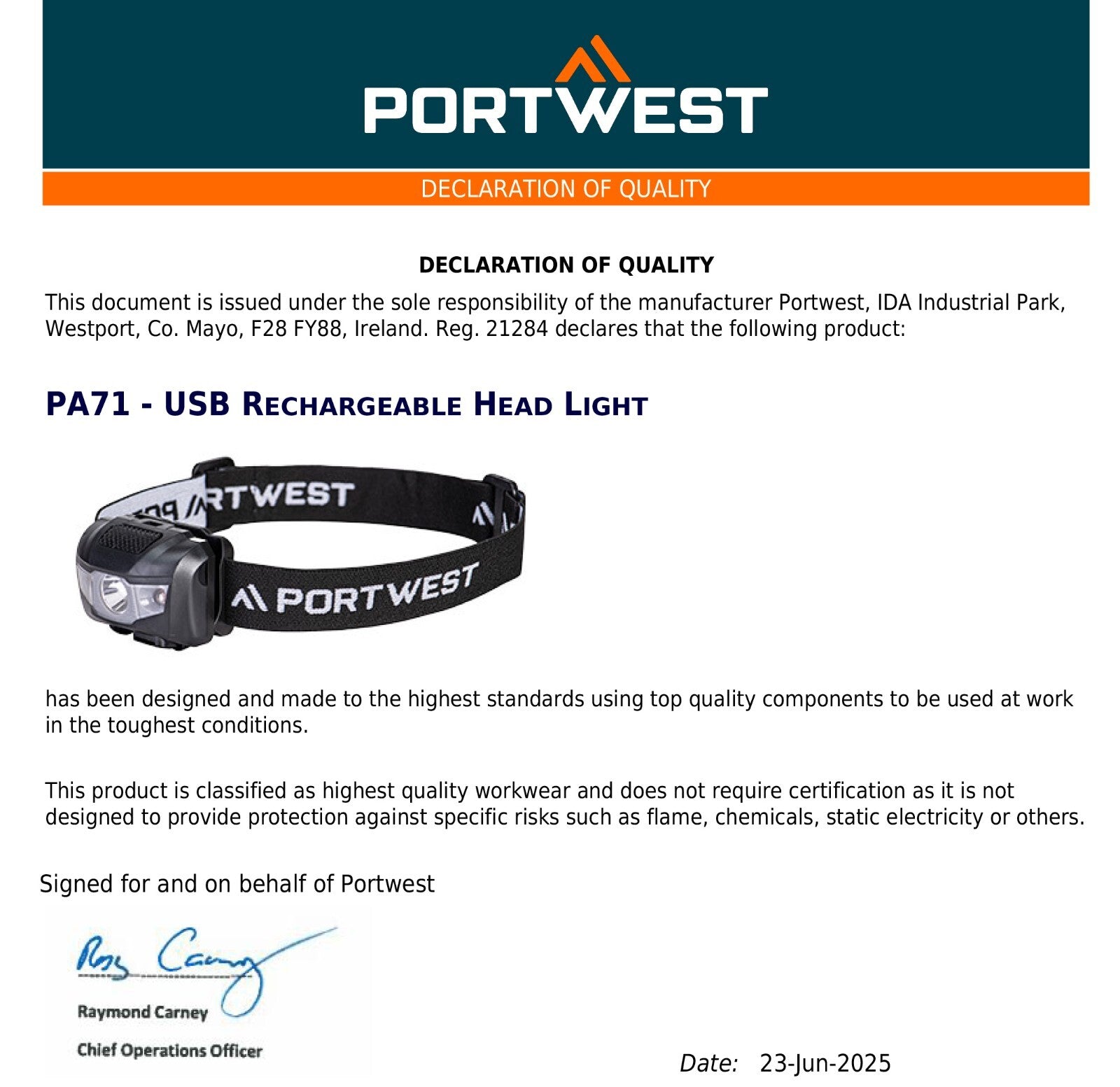 Portwest PA71 USB Rechargeable COB LED Head Torch Light Tilt Headlight Headlamp Super Bright 50m